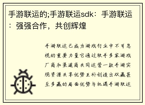为手游开发商提供全方位的运营管理服务,包括用户活跃度提升、社区维护、付费转化等;